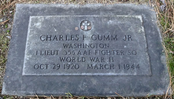 Lt. Gumm is buried at Greenwood Memorial Terrace in his home town of Spokane, Washington, United States of America - where he is still remembered. He was survived by his wife Muriel R. and 10 month old daughter Toni. Muriel subsequently remarried, to Duke Shearin, who had been in Charles' squadron and she adopted her new husband's surname. Lt. Gumm also had three older siblings, a brother Ross and two sisters Velda and Lucille, all whom are now deceased (source: Salley Green, grandniece of Charles Gumm, granddaughter of Lucille). Lucille lived in Coeur d'Alene, Idaho, until she died in July 2010 (source: The Spokesman-Review.com ).